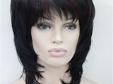 Medium length black with dark burgundy highlight layered 15" long from chin length feathered hairstyles
